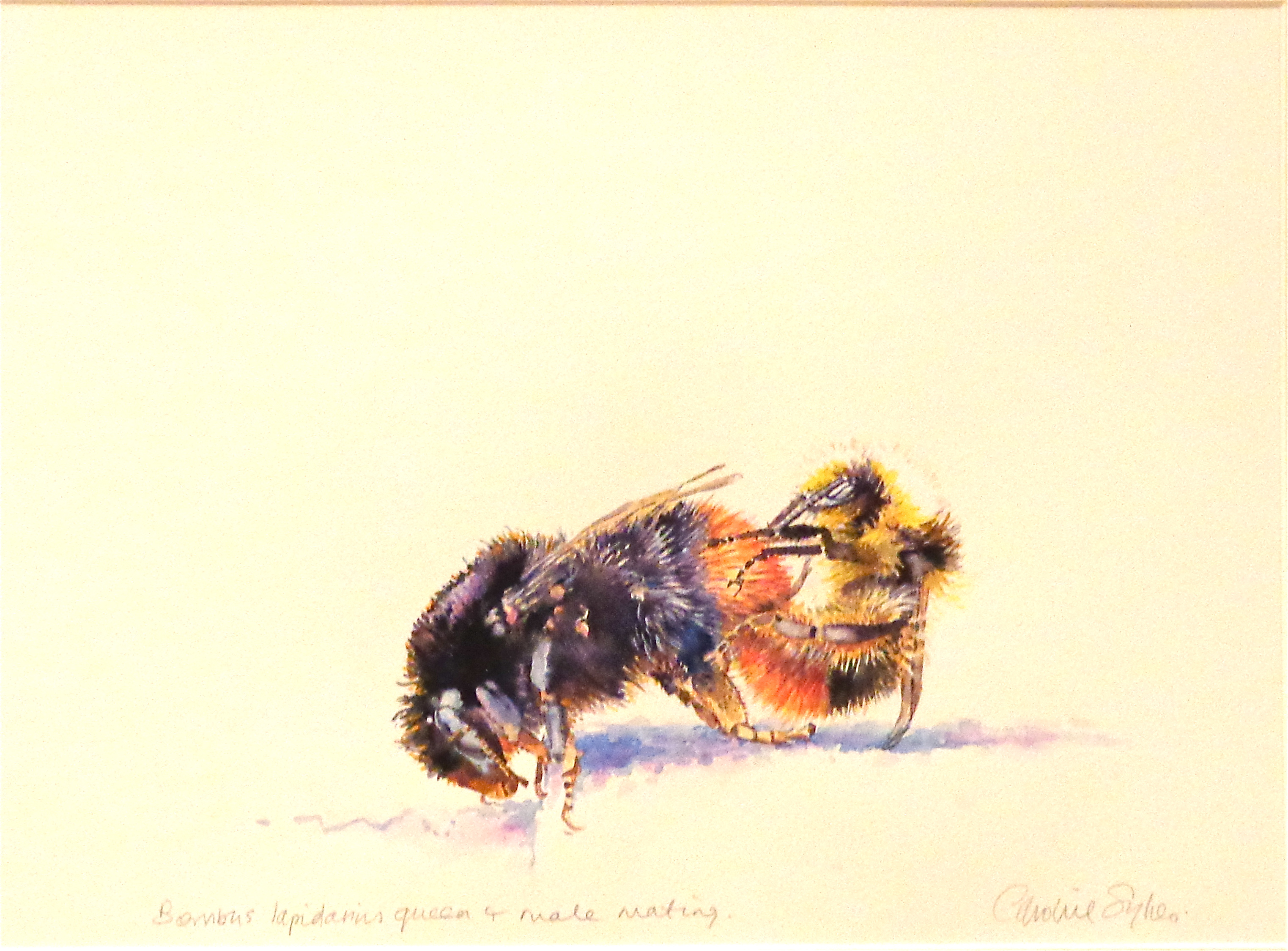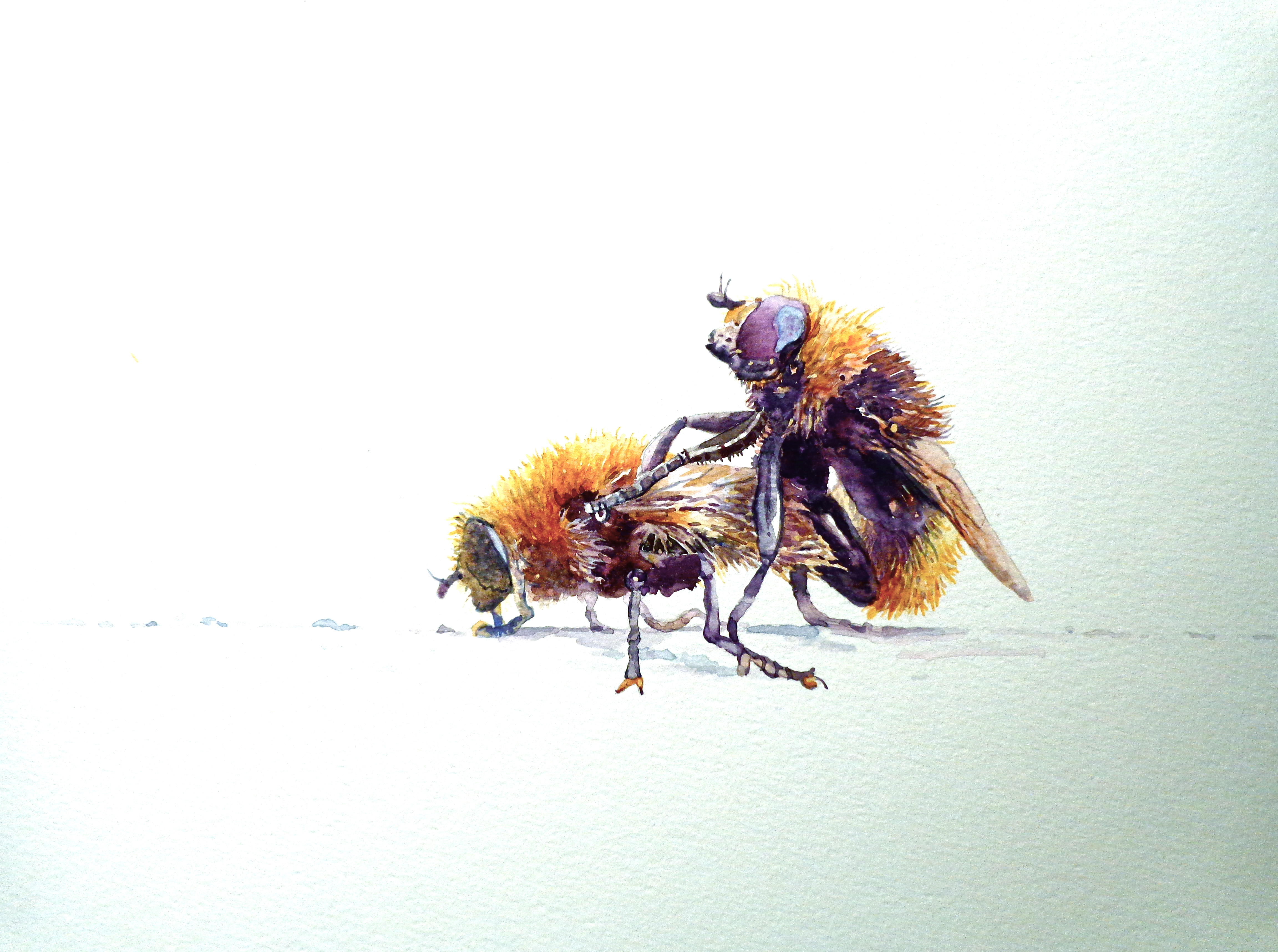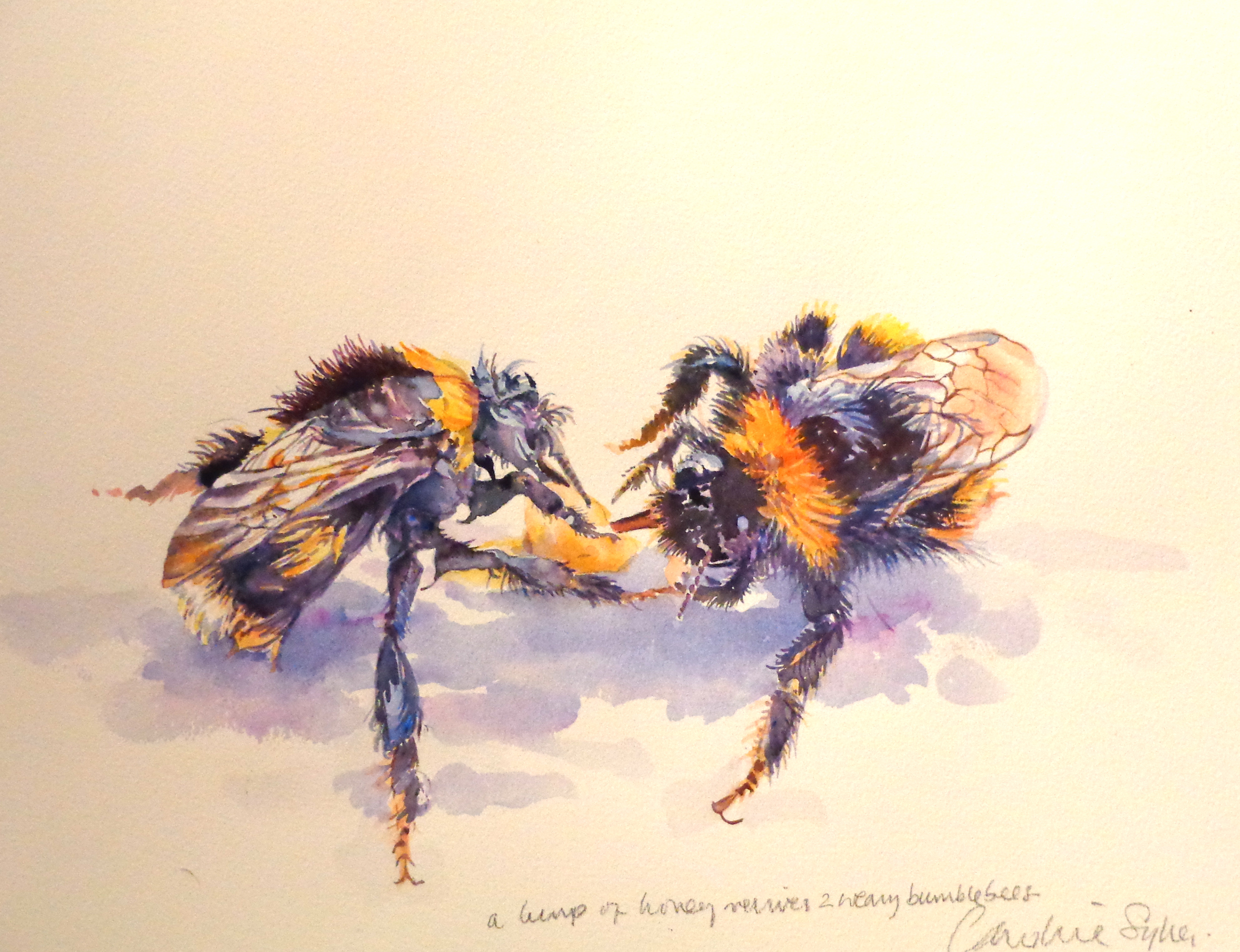 A lump of honey revives 2 weary, wet bumblebeeswatercolour 15 x 11 inches