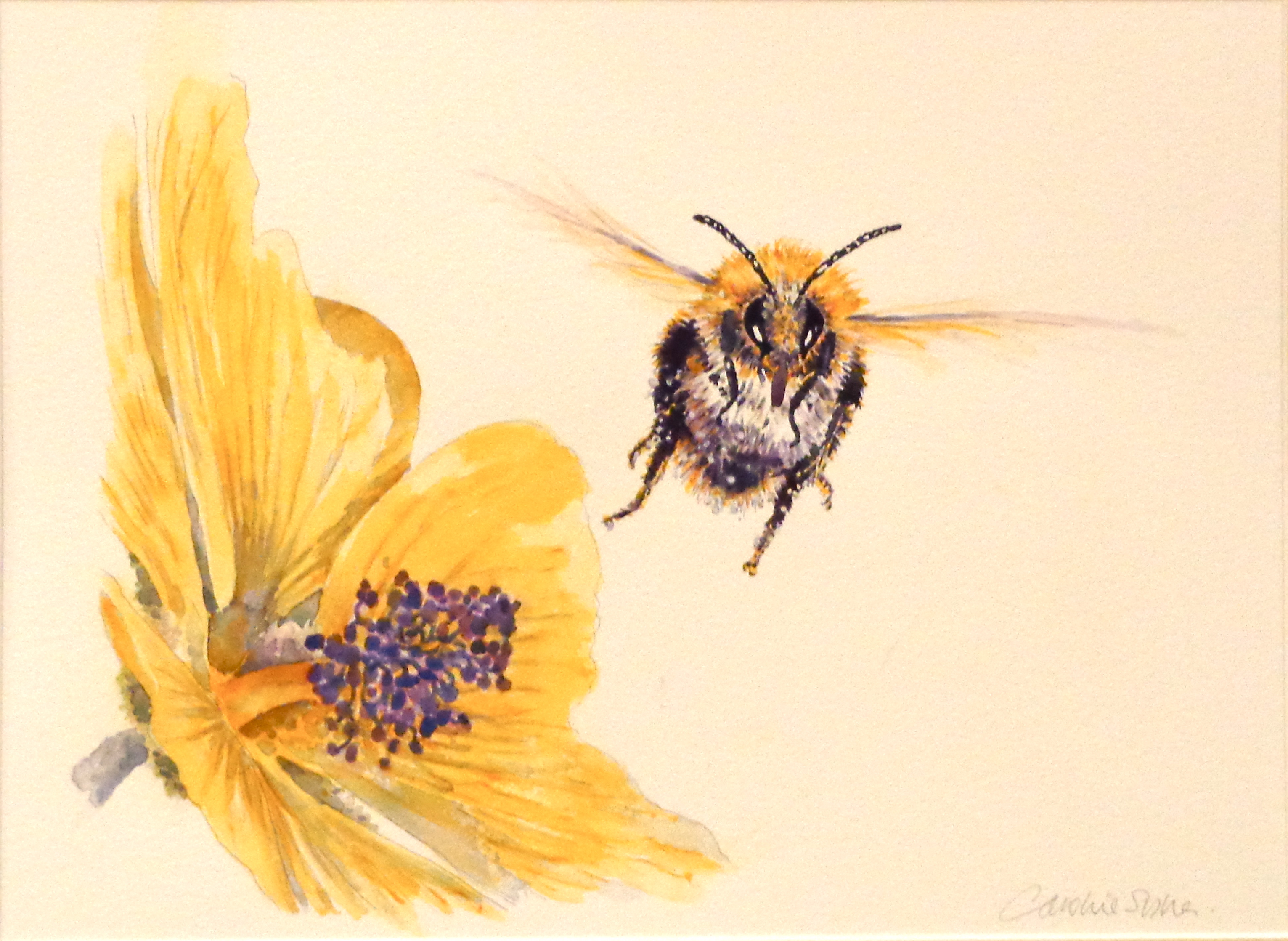Bumblebee flying by yellow flowerwatercolour 15 x 11 inches